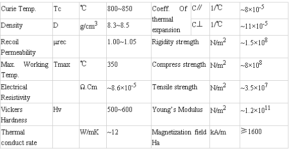 Samarium Cobalt holds its standard property in higher maximum temperatures than neodymium,although its maximum strengh is less. The cost of SmCo material is the most expensive,so SmCo is recommended only when its performance is a high temperature environment is a concern. The characteristics of Samarium Cobalt Magnet