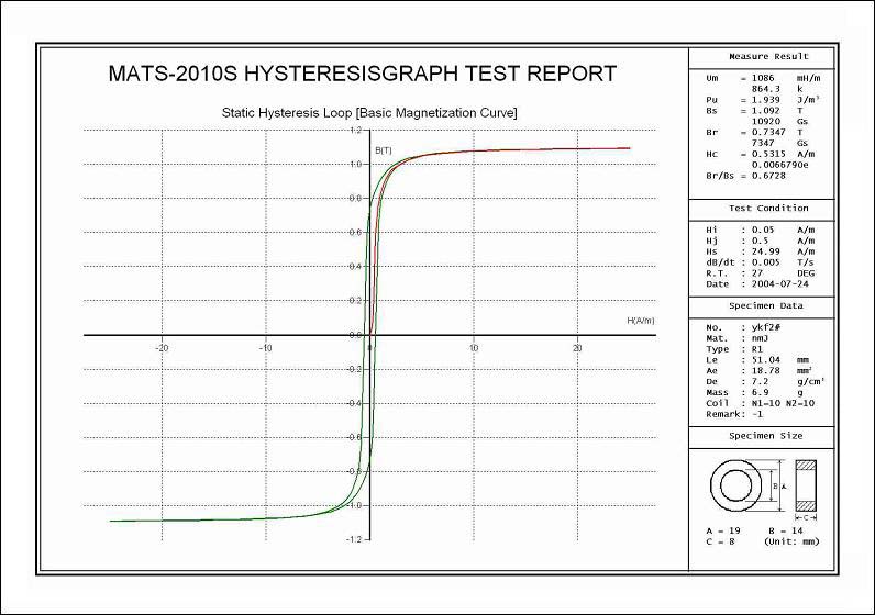Automatic measurement on basic magnetization curve and magnetic hysteresis loop under static state of soft magnetic material, accurate measurement on static magnetic characteristic parameters such as initial permeability μi, maximum permeability μm, saturation magnetic induction Bs, remanence Br, coercive Hc and hysteresis losses Pu.