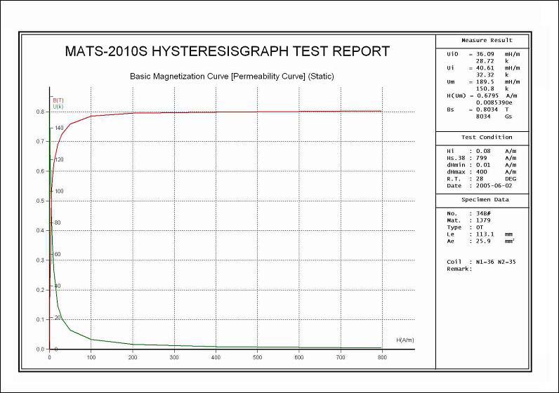 Automatic measurement on basic magnetization curve and magnetic hysteresis loop under static state of soft magnetic material, accurate measurement on static magnetic characteristic parameters such as initial permeability μi, maximum permeability μm, saturation magnetic induction Bs, remanence Br, coercive Hc and hysteresis losses Pu.