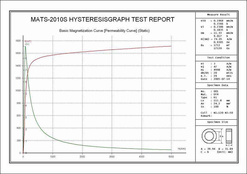 Automatic measurement on basic magnetization curve and magnetic hysteresis loop under static state of soft magnetic material, accurate measurement on static magnetic characteristic parameters such as initial permeability μi, maximum permeability μm, saturation magnetic induction Bs, remanence Br, coercive Hc and hysteresis losses Pu.